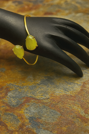 This elegant bracelet features a sleek open cuff design in polished gold, adorned with two teardrop-shaped gemstones at each end. The stones, set in secure prong settings, radiate a subtle charm while adding a touch of color and sophistication to the piece. The minimalist band highlights the gemstones beautifully, making this cuff a versatile accessory that complements both modern and traditional attire. Perfect for adding refined elegance to any occasion.
