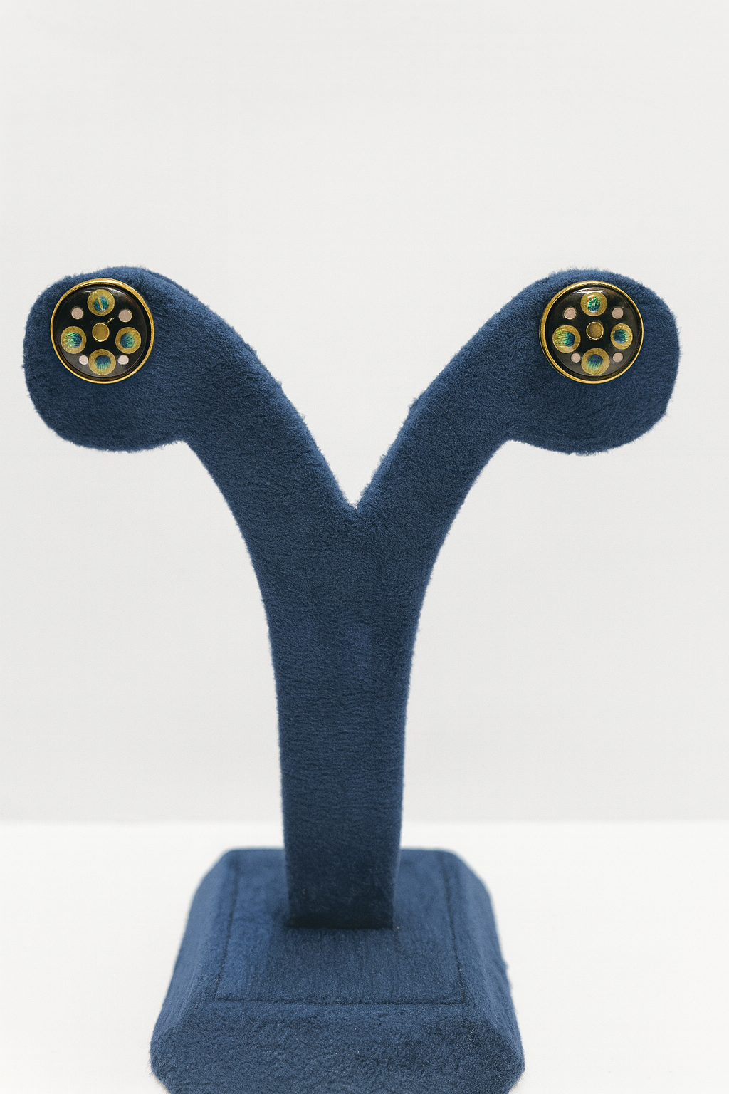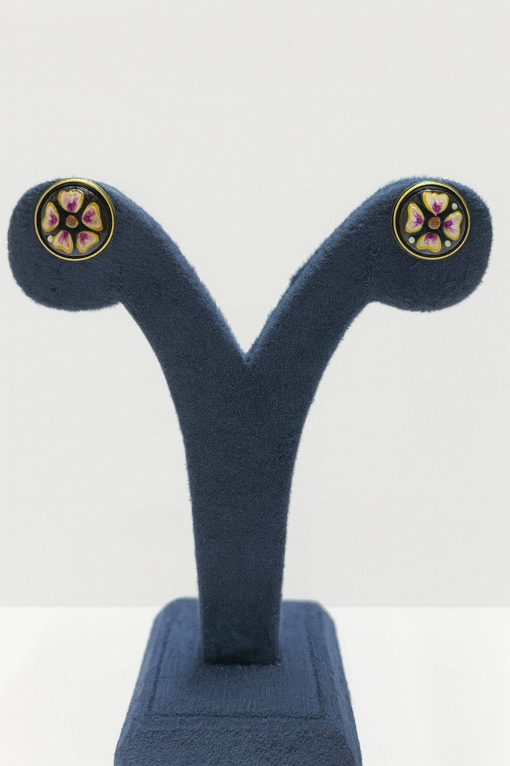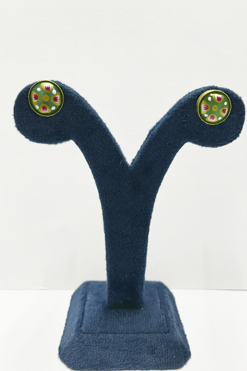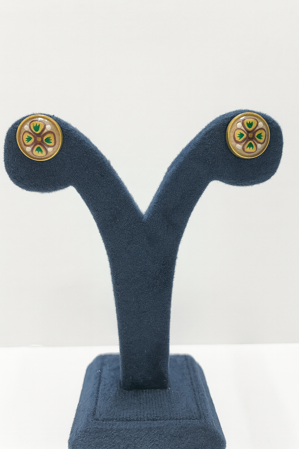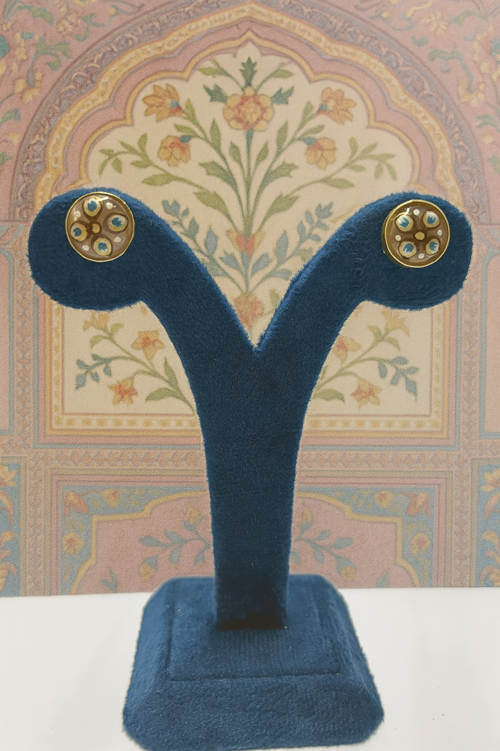Inspired by timeless Mughal artistry, these exquisite stud earrings capture heritage in their design. Crafted in gold, each circular stud is adorned with delicate floral motifs highlighted by radiant blue and white accents, resembling miniature blossoms. Compact yet graceful, these earrings are perfect for everyday elegance or as a subtle touch of tradition for special occasions.