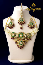 An ode to timeless tradition and grandeur, this handcrafted Kundan Polki set is a masterpiece of regal artistry. The necklace features intricate circular motifs adorned with uncut Polki diamonds, bordered with radiant emerald-green detailing, and accented with deep red drops for a majestic finish. Matching earrings and a maang tikka complete the ensemble, making it a perfect choice for bridal and festive occasions.
