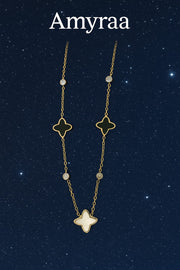 Elevate your style with this exquisite necklace from Amyraa Jewels, crafted to reflect timeless elegance. The design features delicate gold links adorned with luminous gemstones and iconic quatrefoil motifs, symbolizing luck and harmony. A statement mother-of-pearl pendant rests gracefully at the center, capturing the light with celestial brilliance against a backdrop of the stars.