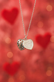 This elegant necklace features a dual-heart pendant, beautifully crafted to symbolize love and togetherness. One heart shines with pavé-set crystals for radiant sparkle, while the other showcases an intricate open-heart design in polished metal. Set against a warm red background of glowing hearts, the image highlights the necklace as a timeless expression of romance and elegance — perfect for gifting or treasuring as a personal keepsake.