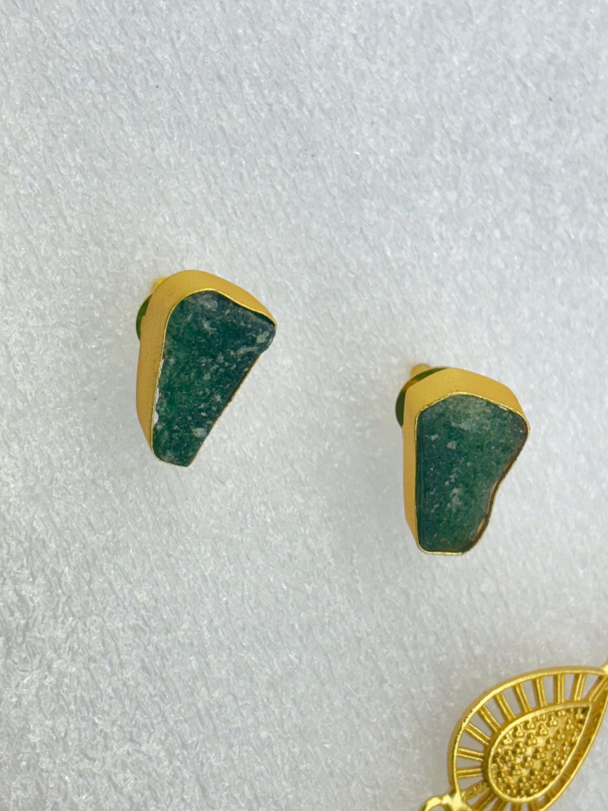 This exquisite handcrafted set features a statement gold necklace paired with raw gemstone accents and matching studs. The necklace showcases a beautifully engraved gold medallion centerpiece, suspended with three natural stone charms that highlight earthy elegance. Each link is adorned with raw-cut gemstones in soft pastel hues, bringing a unique and organic touch to the bold design. Perfect for grand occasions, this set blends traditional artistry with timeless sophistication, making it a treasure for jewelry lovers.