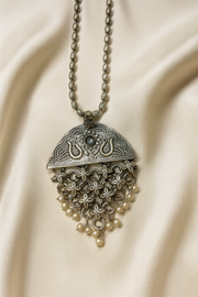This exquisite necklace is a true representation of traditional temple jewelry artistry. The pendant features a half-moon design intricately engraved with floral and peacock motifs, symbolizing beauty, grace, and prosperity. Below, cascading floral filigree work adorned with delicate pearl dangles adds rhythm and elegance to the piece. The beaded silver chain enhances its antique charm, completing the regal look.