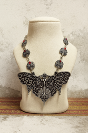 Royal Oxidized Silver Statement Necklace with Red Accents