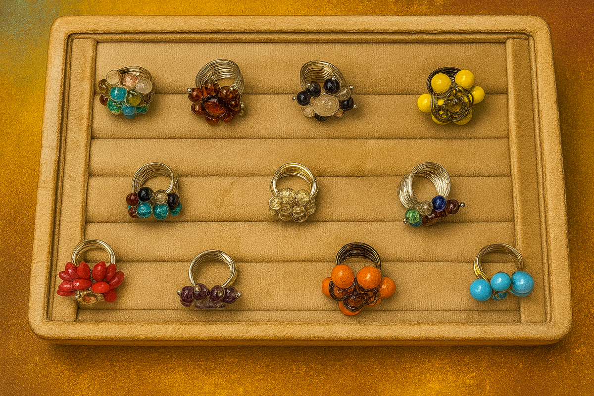 A deep violet cabochon sits gracefully at the center, encircled by rich wine-red beads that radiate like petals of a flower. Each bead is accented with delicate silver-toned spheres, adding a touch of refinement and balance to the design. The floral composition evokes grace, femininity, and eternal charm—making it a statement of both boldness and delicacy.